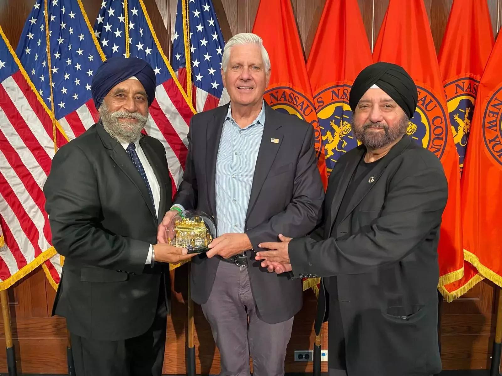 Presenting the Sri Golden Temple Replica to Nassau County Executive Hon. Bruce Blakeman and New York State Republican Chairman Hon. Edward Cox (Son-in-Law of Former US President Hon. Richard Nixon) are American Punjabi Society President Gary Sikka and Sr. Vice President Mohinder Singh Taneja.